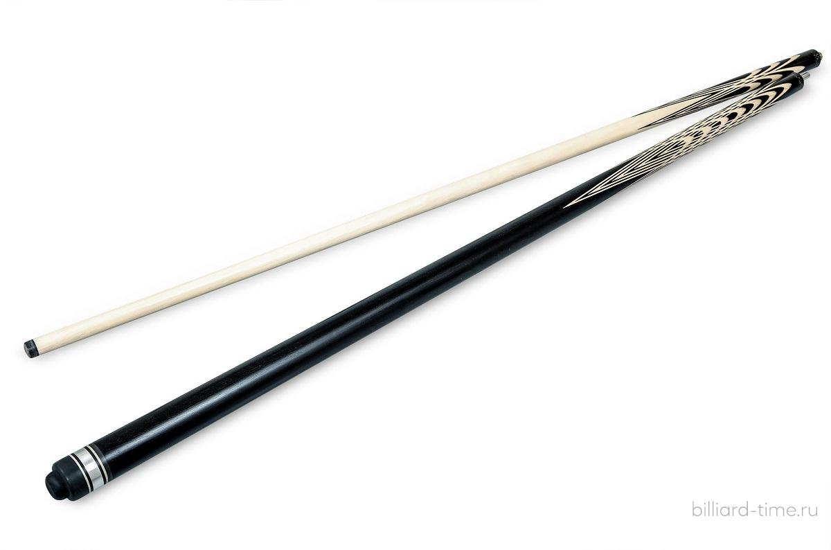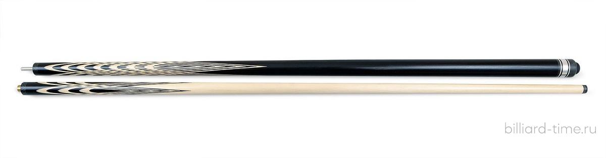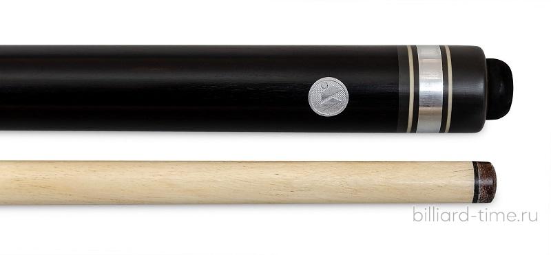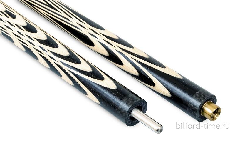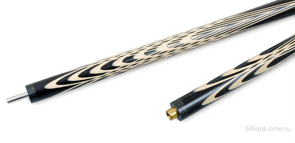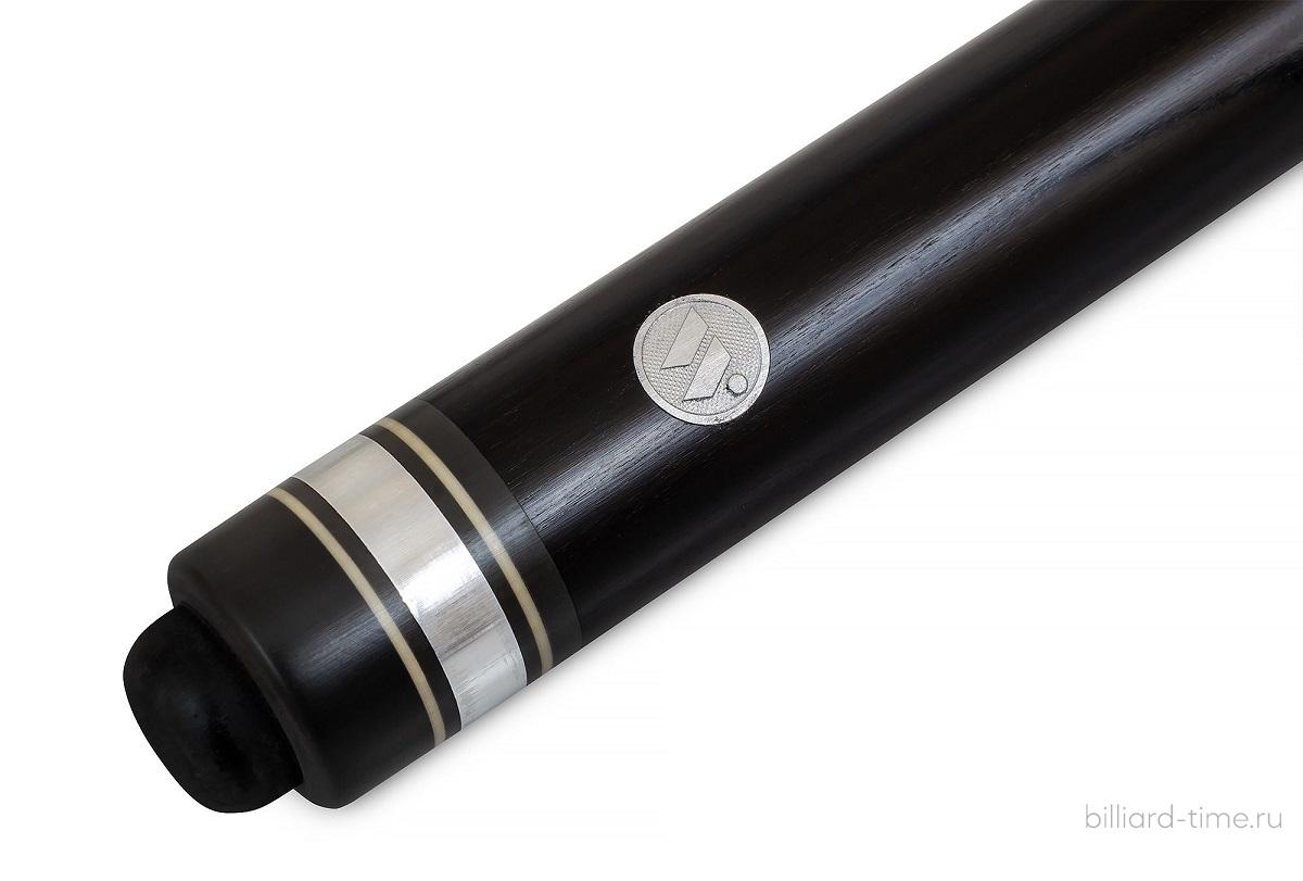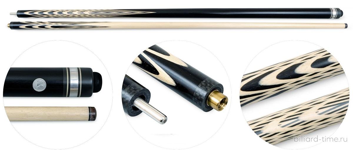 Кий двухсоставной, ручной работы. Заготовка собирается из цельных клиньев, а обрабатывается только методом продольного снятия вплоть до шлифовки включительно. Наклейка Triangle, 12,5 мм. Под ней располагается фибра из карбона для того, чтобы шафт не трескался. Скрутка вакуумная, бронза-нержавеющая сталь, укреплена бандажными кольцами из углепластика, он же карбон для защиты стыка от трещин и других дефектов. Этот двух-составной кий ручной работы выглядит превосходно. Однако еще интересней его игровые характеристики, надежность и долговечность.